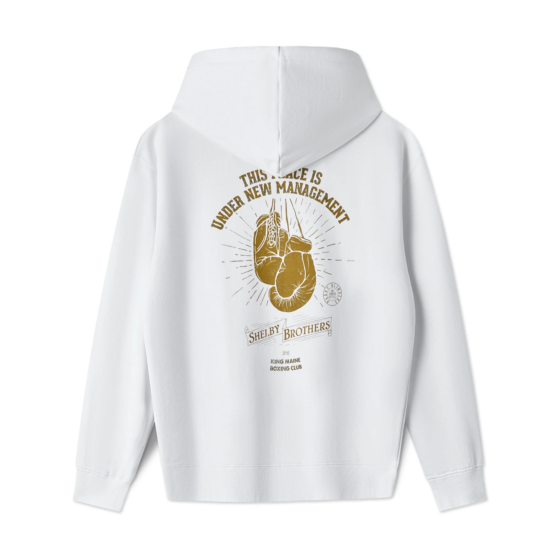 The official Peaky Blinders âBoxing Club â Under New Managementâ hoodie from Birmingham Wear stands out with its signature premium print that draws attention.